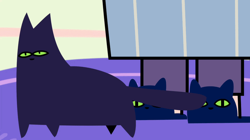 A witch and her 13 shape-shifting cats wake up to an empty pantry. She throws on her cat-made outfit to grab food, but it’s way too pricey. Then she spots the cashier—who looks like a giant fish. Perfect. She and her cats decide they’ll take her home for dinner instead.